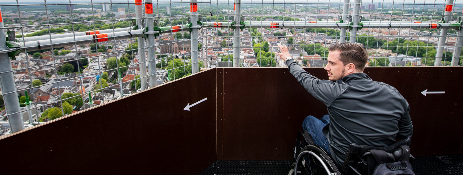Utrecht, 10 juli 2020 – De 24-jarige Thom Stulen is vrijdag als eerste met de bezoekerslift van de Utrechtse Domtoren omhoog gegaan. Dit markeert de opening van de lift, waarmee het uitzicht op 100 meter hoogte voor niemand meer onbereikbaar is. De Domtoren is nu écht voor iedereen.